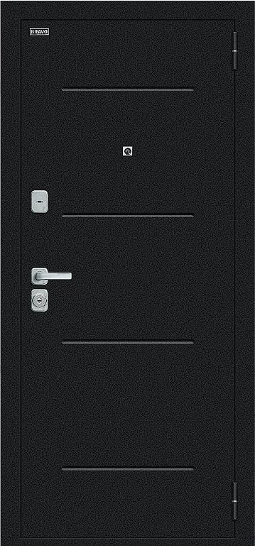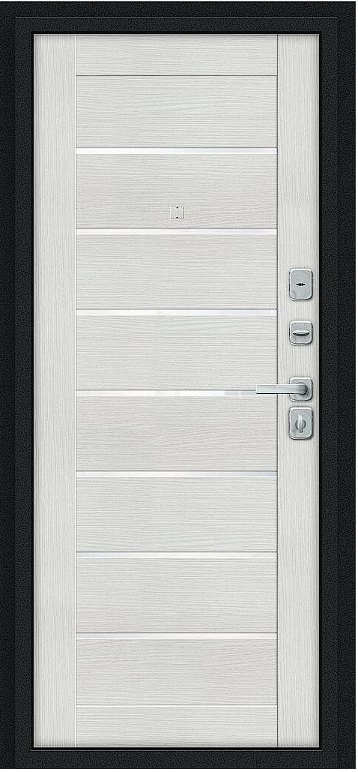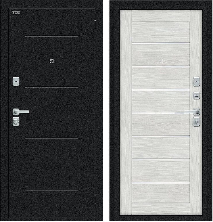 Надежная входная Дверь Браво Техно/BChrome Букле черное/Bianco Melinga премиум класса по цене 34 735 руб. Большая толщина стали защитит от проникновения в ваш дом, квартиру или коттедж. Используется очень качественная фурнитура: замки, цилиндры, ручки, защелки. Покрытие и отделка двери изготовлено под внимательным контролем производителя. Дверь имеет долгий срок службы и гарантию.